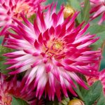- マゼンタパープルの先端を持つ、白い八重咲きのサボテンダリア。目を引く花は最大15cmの幅があり、長くとがったベルベットのような花びらを咲かせます。丈夫な茎は、激しい雨にも負けずにしっかりと立ち上がります。